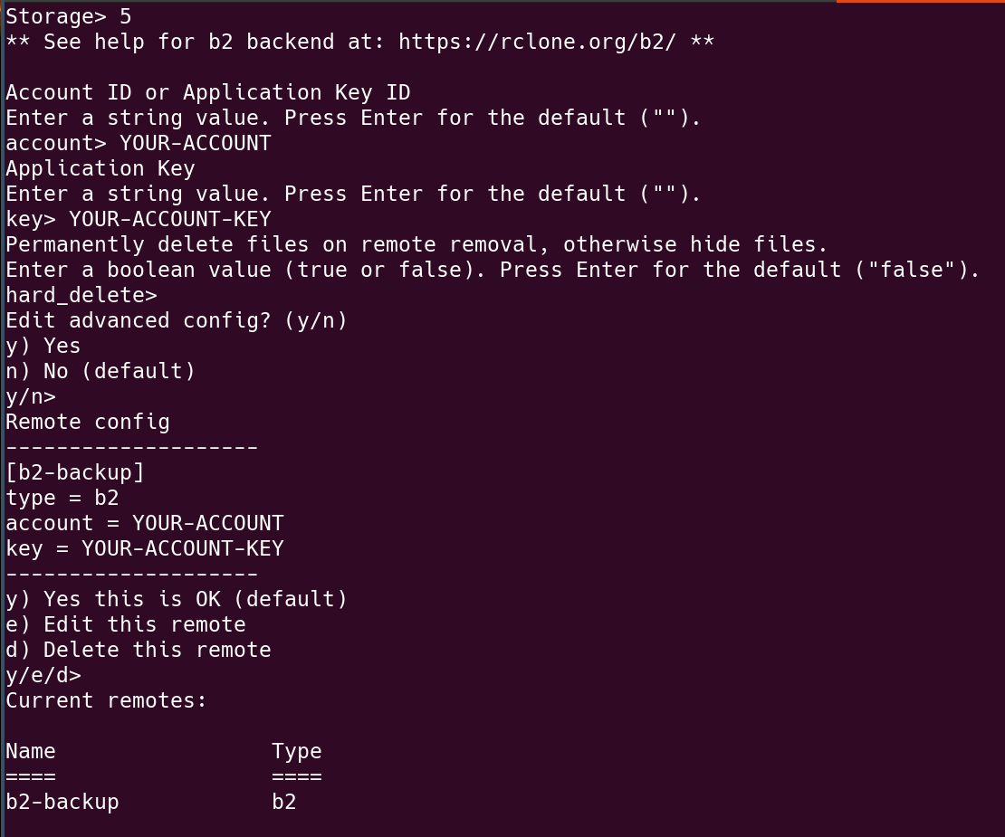 The name of the remote is b2-backup. I can use this name to connect with the Blackblaze server and perform operations like sync, dir list, etc.