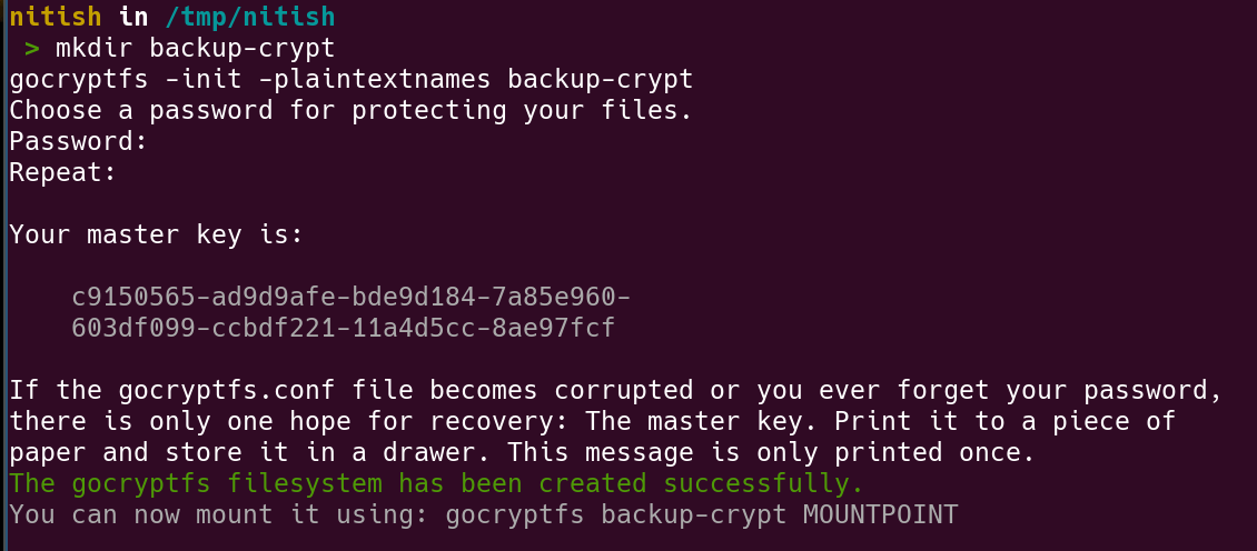 This would create a new gocryptfs.config file inside the backup-crypt directory. Avoid losing this file because the gocryptfs.config is required to decrypt the files.